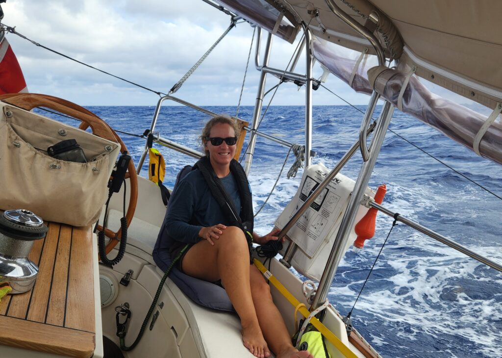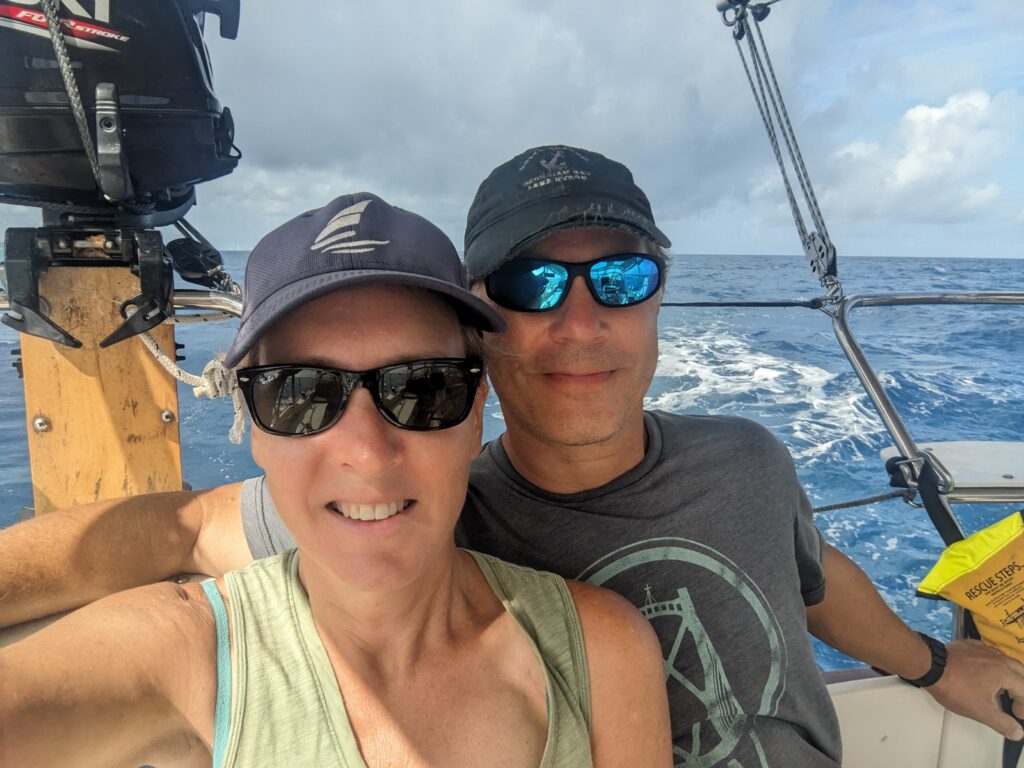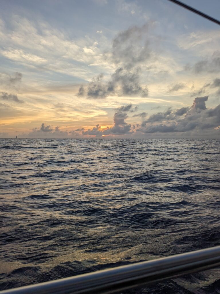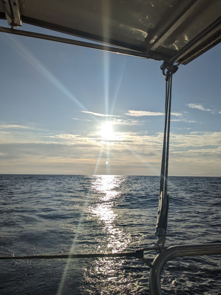 Where we are now, several hundred miles south of Bermuda, the ocean is a beautiful lapis blue, speckled with golden-brown patches of sargasso weed. Our Garmin tracker shows that we’re about 2 degrees of longitude west from the path we took on the way to Antigua in 2022 (too bad we didn’t have this weather and sea-state on that trip!). The ocean temperature has dropped a few degrees from what it was in St. Martin, and you can feel the change in air temperature as well. Last night I was cold enough to wear my wind-breaker while on watch – tonight I may even have to wear long pants!