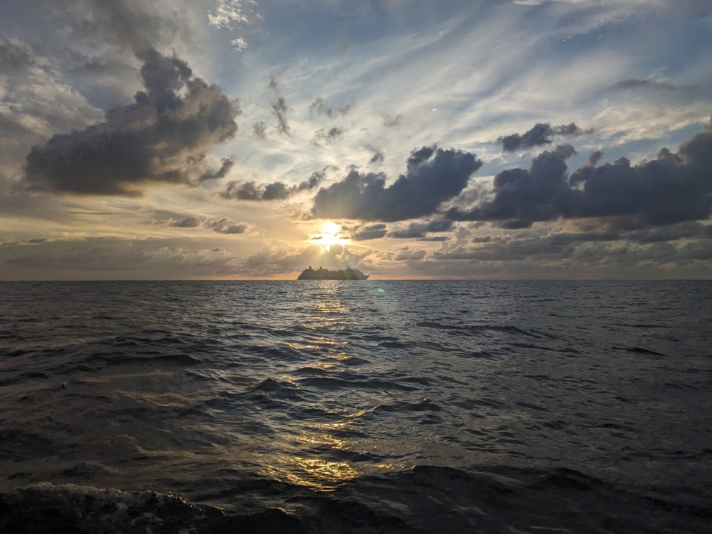 With the high pressure has come clear blue skies. At times not a single cloud in sight. And this has been a real treat at night. The new moon was only a couple of days ago, and the thin crescent moon we have now sets early in the evening leaving dark skies absolutely covered in stars. Looking out at night, the ocean goes black and the humidity above the water fuzzes away the horizon line while the stars reflect in the calm water making it unclear where the ocean ends and the skies begin. It’s easy to pick out the north star just off our bow and then turn and look behind to see the southern cross just above the horizon. Shooting stars are frequent and the Milky Way is vivid streaking across the sky. The hours on watch go by quickly as you stare out across the sea.